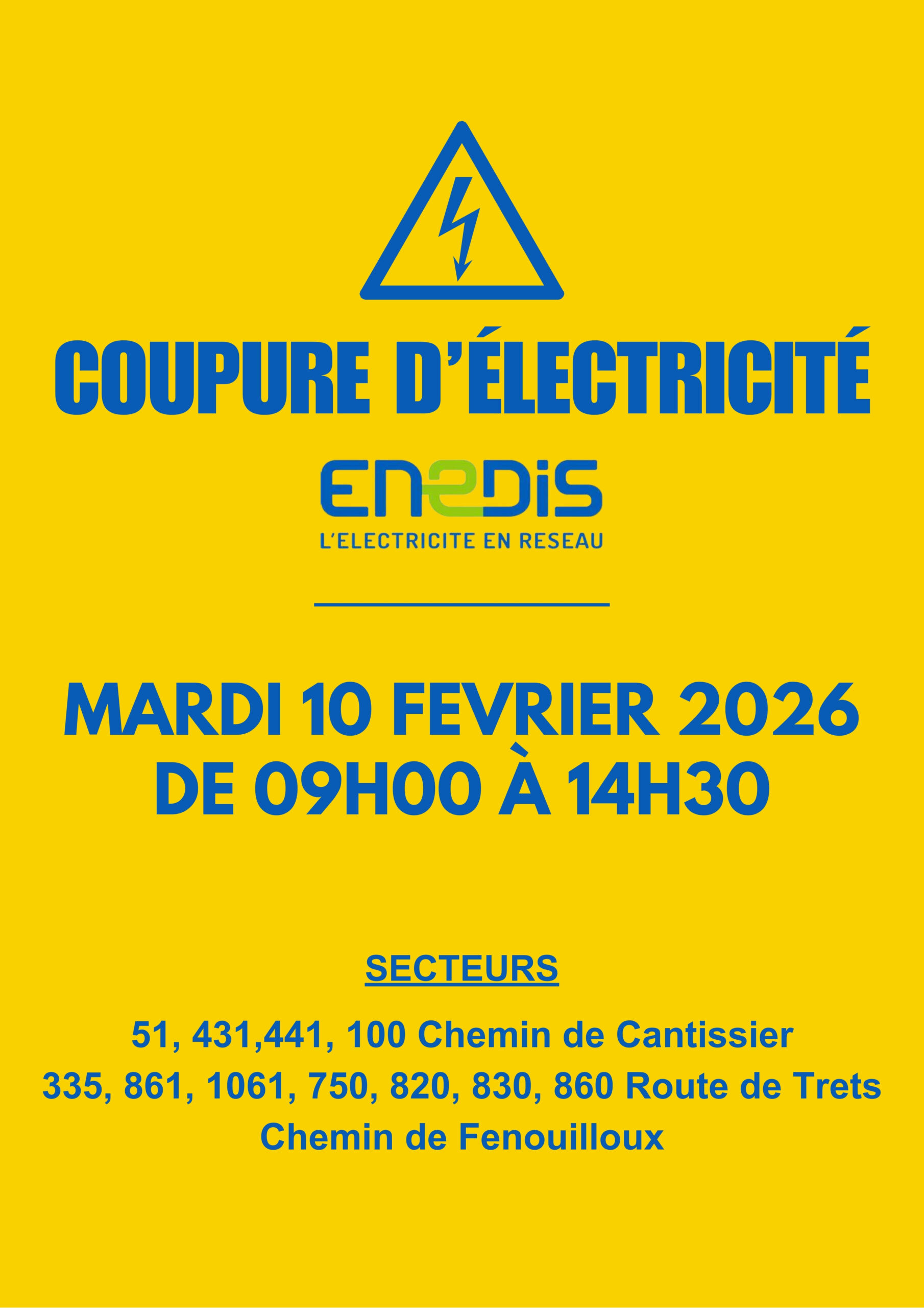 La société ENEDIS nous informe qu’une coupure d’électricité aura lieu afin d’améliorer la qualité de la distribution électrique et de répondre aux besoins des habitants.